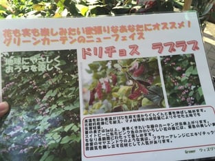 花の咲くグリーンカーテンは目も楽しませてくれます。ドリチョスラブラブって、わくわくするネーミングです。ふじまめの一種で実がなりますよ。