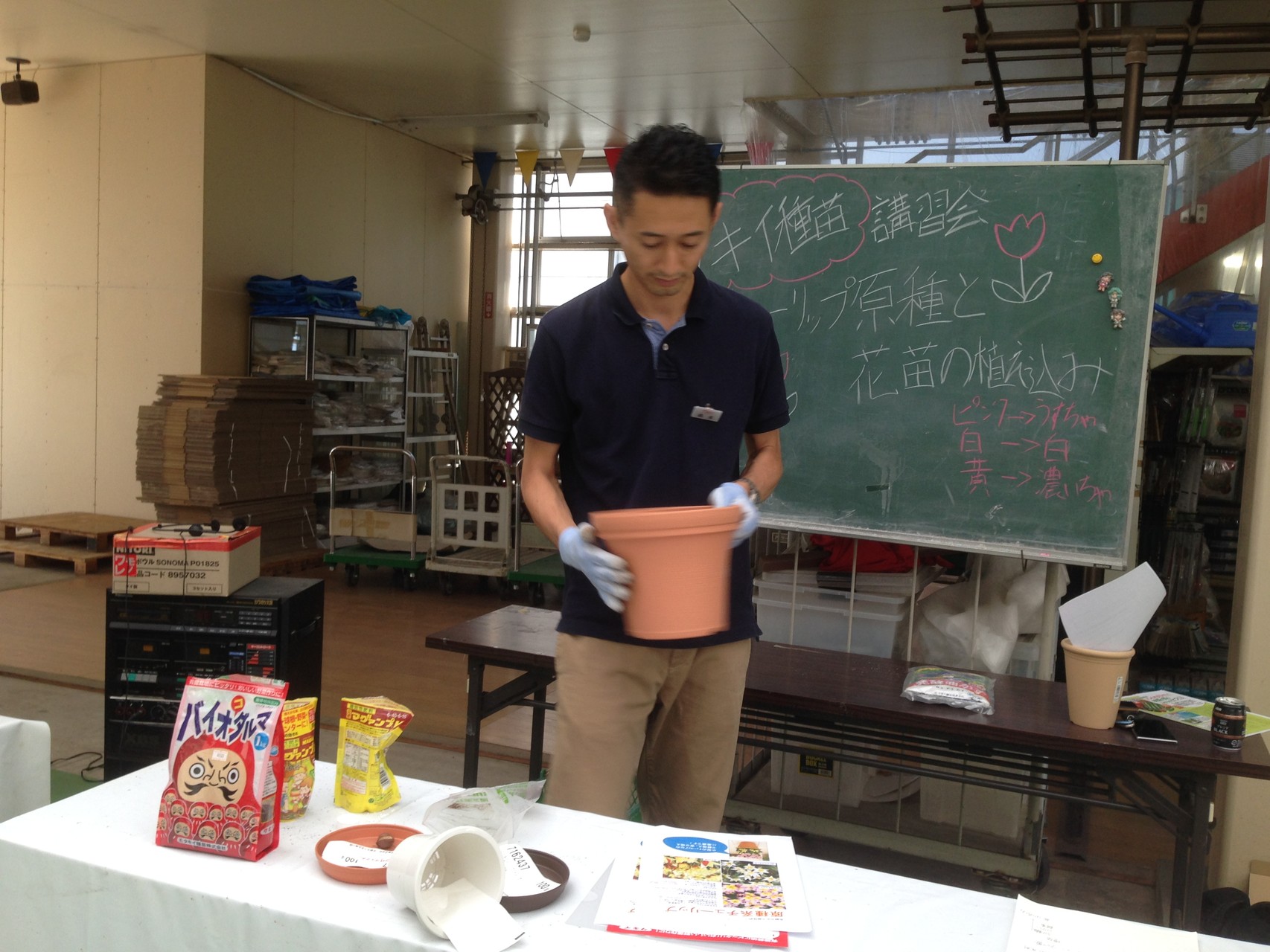 この教室では種苗メーカー「タキイ種苗」の講師によるチューリップの原種と花苗の、上手な植えこみ方を教えていただきました。皆さん真剣な面持ちで説明を聞いていました。