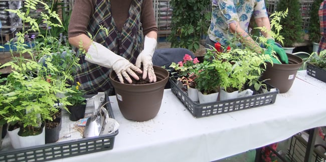 壁に吊るしたり掛けたりして楽しめる ハンギングバスケット の教室では、花の植え込み方や植え方のバランスなどを紹介しました。参加者の方は、色やバランスをみながら思い思いにバスケットを楽しく作ることができました。